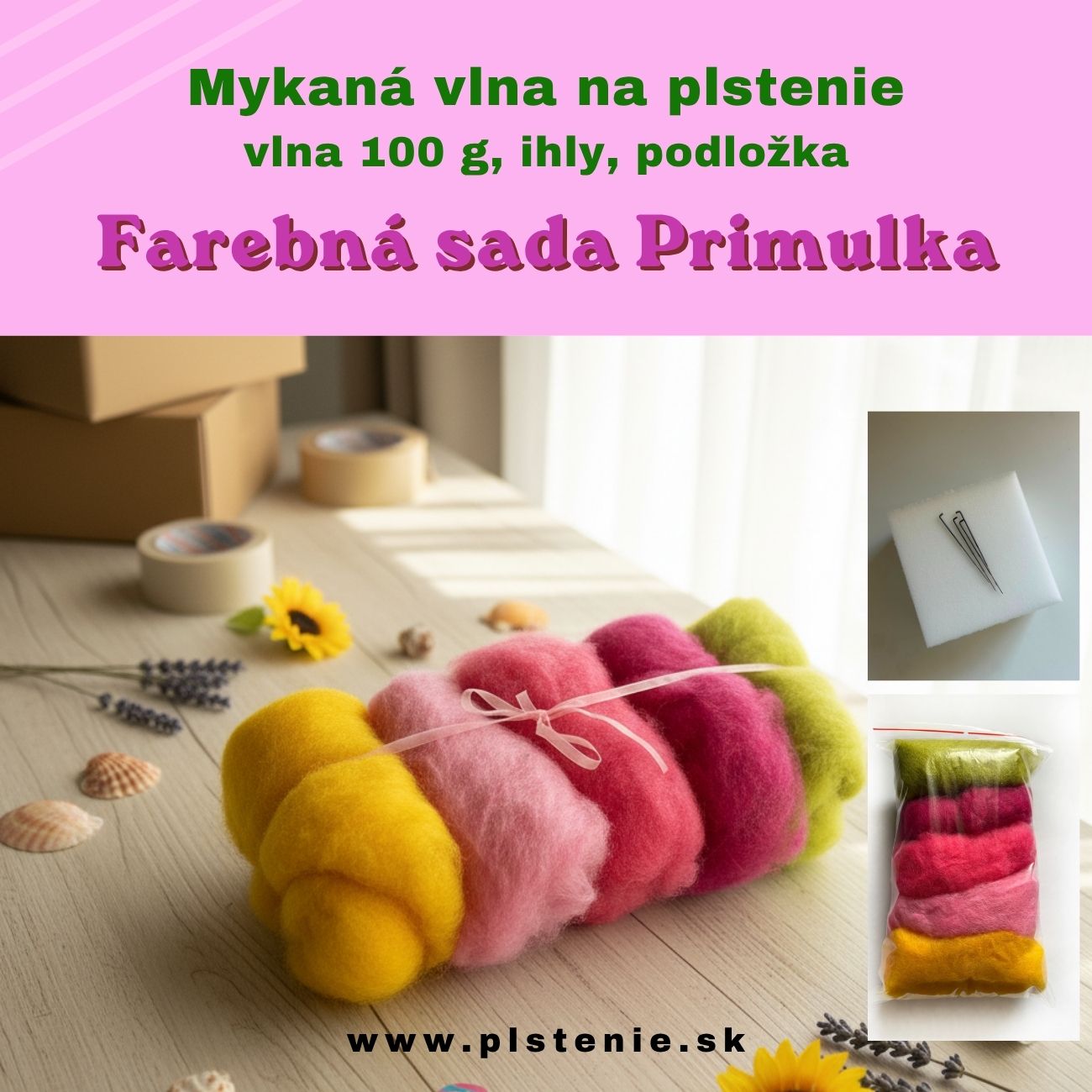 Úvod »Kompletné sady +ihly+podložka» Kompletná sada Primulka - 100 g mykaná vlna, 5 ks ihly, podložka