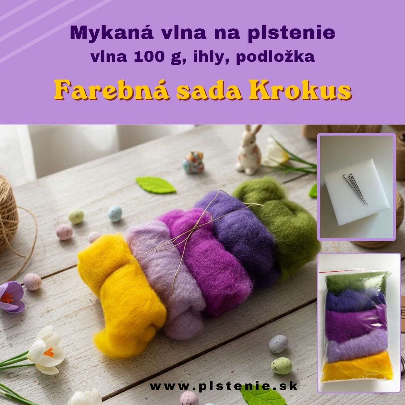 Úvod »Kompletné sady +ihly+podložka» Kompletná sada Krokus - 100 g mykaná vlna, 5 ks ihly, podložka