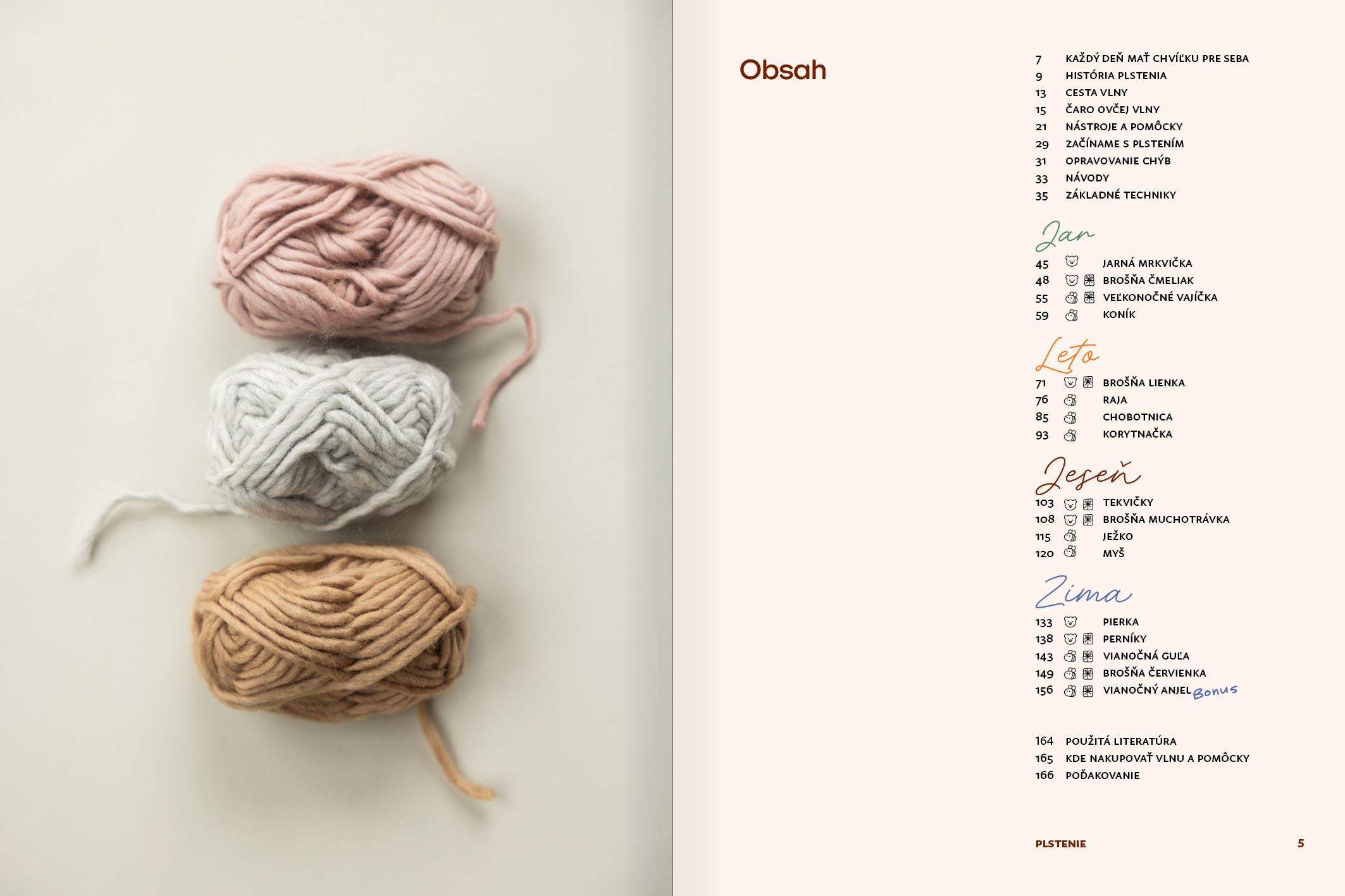 Kniha obsahuje informácie o druhoch vlny a potrebných pomôckach, taktiež podrobne popisuje základné techniky suchého plstenia. Najväčšiu časť tvorí 16 foto-návodov rozdelených do 4 ročných období a jeden bonusový. Návody sú určené pre začiatočníkov (dospelí aj deti od 9-10 rokov), na svoje si prídu aj mierne pokročilí, ktorí sa naučia nové "vychytávky" v plstení. Poteší ako vianočný darček pre dcérku, synovca, ale aj mamu, či tvorivú kamarátku.